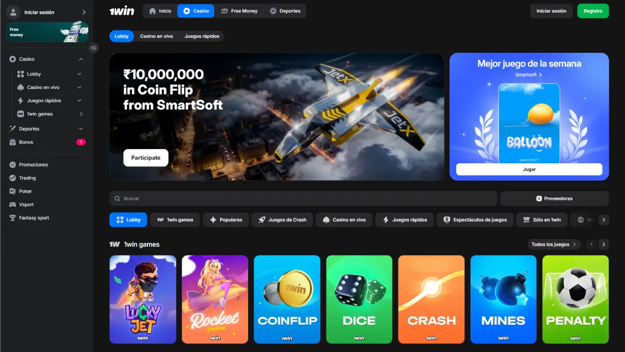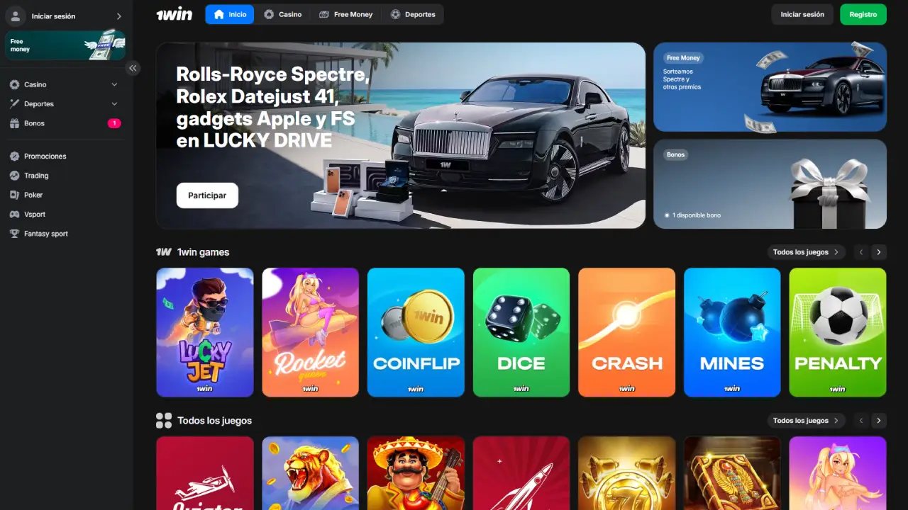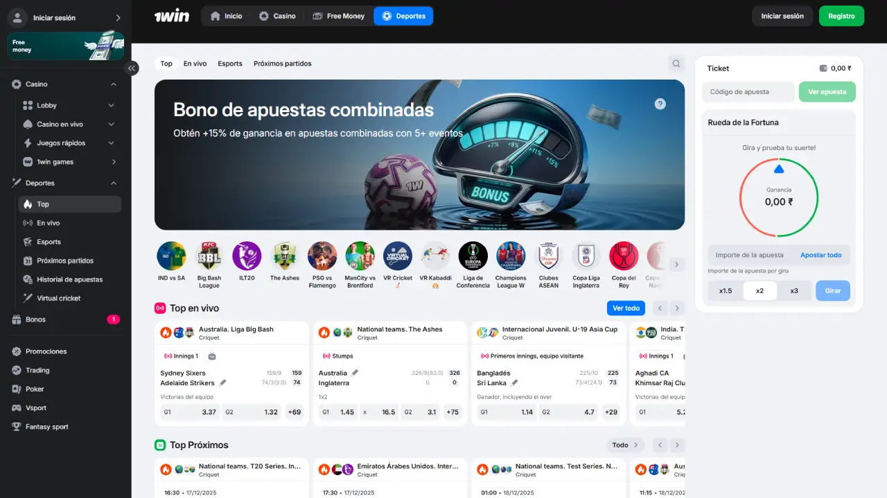 La interfaz de 1win para usuarios de países hispanohablantes es limpia, rápida y pensada para que encuentres tu próxima apuesta en pocos clics. En la barra superior verás accesos directos a Deportes, En vivo, Casino, Casino en vivo, eSports, Promociones y Soporte, además de los botones de registro e inicio de sesión.